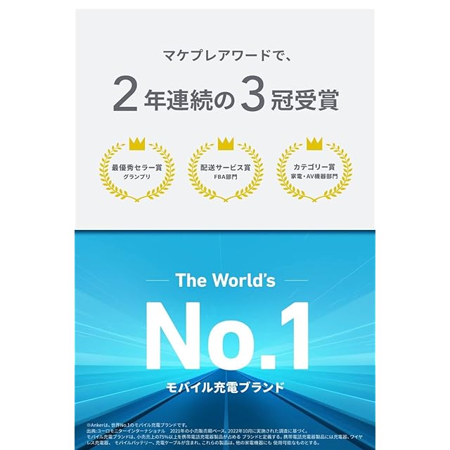 安心の大容量:モバイルバッテリー&充電器一体型モデルでは最大クラスの約10000mAhの大容量で、iPhone 15に約2回、iPad mini 6に約1.3回、その他ほとんどのスマートフォンに複数回、満充電することができます (※充電回数はAnker調べです) 。