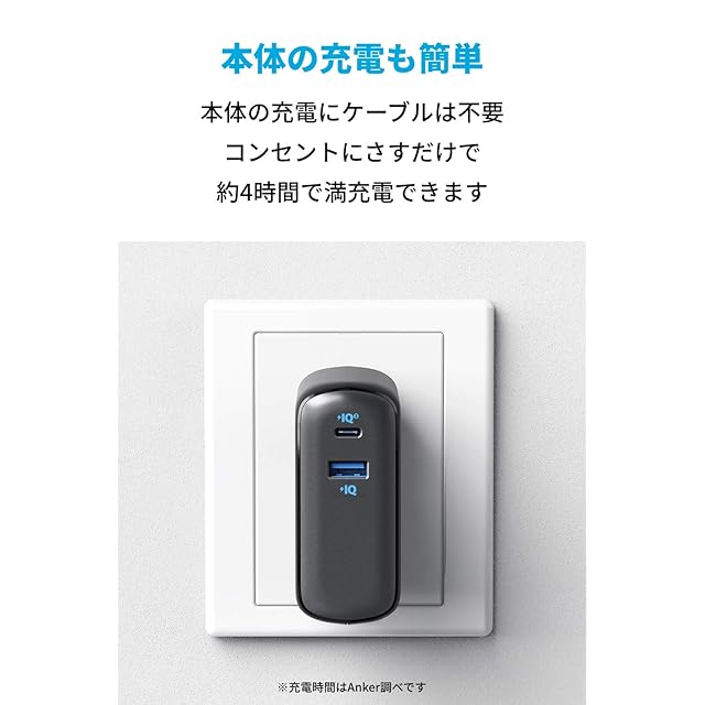 本体の充電も簡単:本体の充電にケーブルは不要です。コンセントにさすだけで約4時間で満充電できます。(※充電時間はAnker調べです)