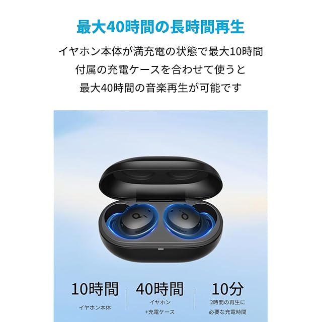 長時間再生・短時間充電:イヤホン本体が満充電の状態で最大10時間、付属の充電ケースを合わせて使えば最大40時間の音楽再生が可能です。また、10分間の充電で約2時間の音楽再生が可能です。