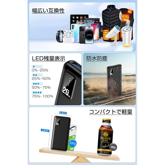 【20000mAh大容量 |長時間の安心を提供】この モバイルバッテリー は、20000mAhという 超 大容量 を誇り、iPhoneやAndroidスマートフォンを最大5〜6回以上フル充電可能です。タブレット、スマートウォッチ、ワイヤレスイヤホンなど、複数の デバイス にも十分な電力を供給できる モバイルバッテリー です。キャンプ、旅行、通勤、ビジネス、災害時の非常用電源など、あらゆるシーンで頼れる大容量 モバイルバッテリー です。飛行機持ち込み可能な容量で、国内外の旅行にも安心して使える モバイルバッテリー です。