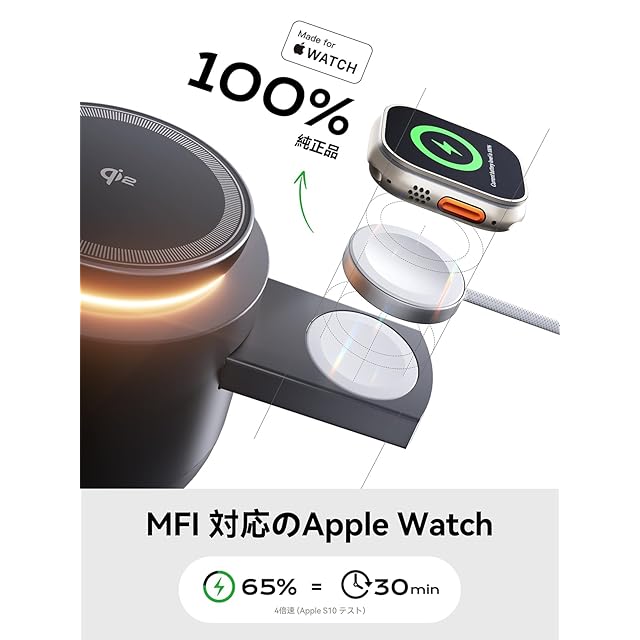 【MFi認証済み & Apple Watch対応】Apple公式認証取得済み iPhone 16/15/14/13/12/11/X/8、iPad、iPod、Apple Watchと完全互換性を保証。Apple正規認証であるMade for Apple Watchも取得. iOSアップデート後も警告表示なしで安定動作!Apple認証チップと高品質素材採用で過熱/短絡/機器損傷を防止。非認証充電器比最大3倍の高速充電を実現。非認証品と異なり100%バッテリー健康保護を維持し、システムアップデート起因の充電トラブルを回避。本物のMFi認証製品をお選びください!