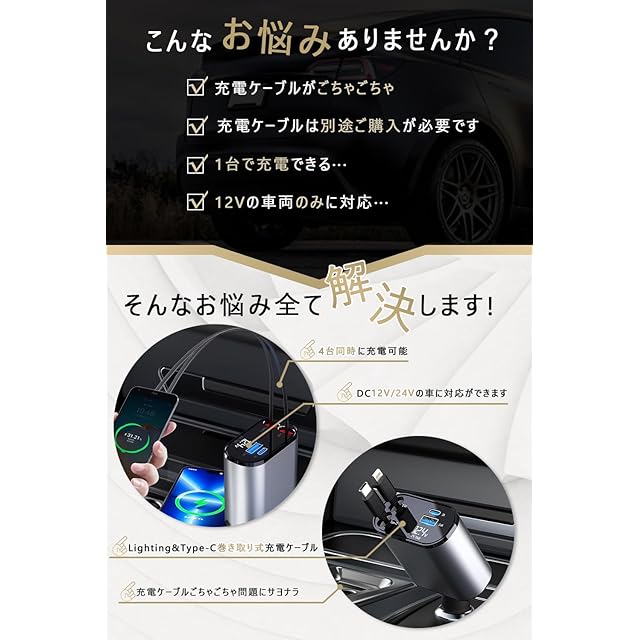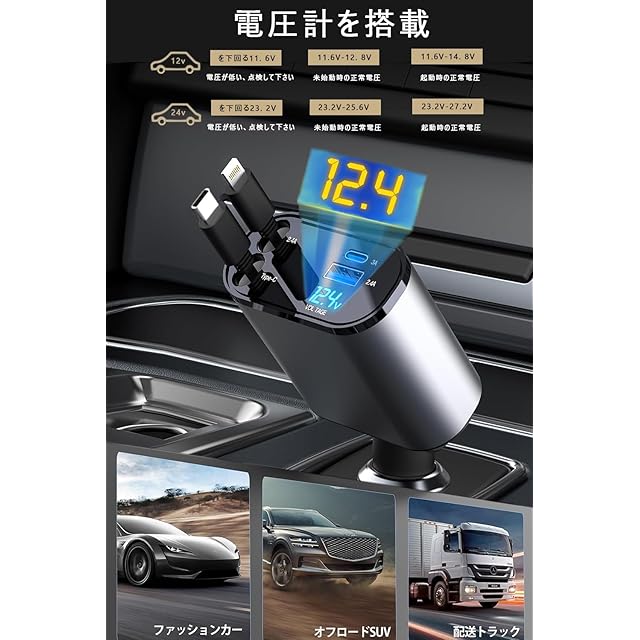 【巻き取り式】4in1 車 充電器 シガーソケット 4台同時充電 カーチャージャー 巻き取り式充電ケーブル 2本 Type-C100W/Lightning 20W急速充電 対応iPhone 16/15/14/13/12, Galaxy S22/S21 UItra, Xperia, iPad, AQUOSなど 電圧計を搭載 DC12/24V車対応
