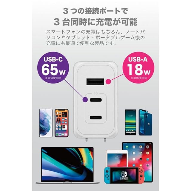 超急速充電が可能なPD(USBパワーデリバリー)に対応したコンセント充電器。新素材GaN(窒化ガリウム)を半導体(集積回路)に採用。従来のシリコン半導体に比べ低発熱と小型化を実現。最大出力65W給電でノートパソコン、スマホやタブレット、ゲーム機の充電に最適。Type-Cポート×2とUSB-Aポート×1を搭載。過電流・過電圧保護機能を搭載した安全設計。90°回転式プラグACプラグ採用で収納、持運びに便利。海外でも使用できるAC100V/240V対応。※国や地域によって市販の変換プラグが必要になる場合があります。※本製品に充電用ケーブルは付属されていません。 主な本体仕様 : ●入力:AC100V~240V 50/60Hz 1.5A max ●USBポート仕様 USB-C x 2ポート(PD65W対応)、USB-A x 1ポート ①USB-C1:PD65W(5V/3A,9V/3A,12V/3A,15V/3A,20V/3.25A) ②USB-C2:PD65W(5V/3A,9V/3A,12V/3A,15V/3A,20V/3.25A) ③USB-A1:18W(5V/3A,9V/2A,12V/1.5A) ④USB-C1+C2:PD45W+PD20W ⑤USB-C1+A1:PD45W+18W ⑥USB-C2+A1:15W(5V/3A) ⑦USB-C1+(C2+A1):PD45W+15W(5V/3A)※3ポート同時使用時合計最大60W ●サイズ:約W32×H54×D52mm(ACプラグを含まず)●質量:約123g ●材質:本体ケース PC、ACプラグ 銅合金 ●保証:1年保証