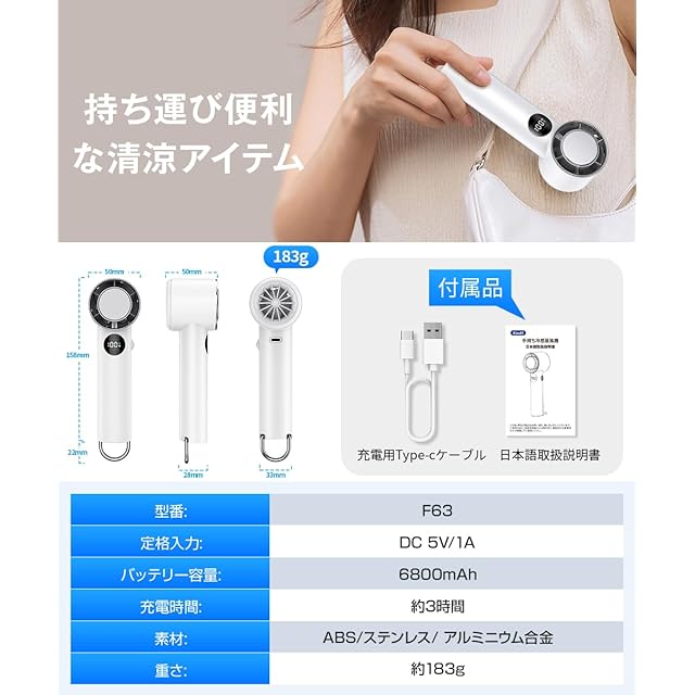 【軽量・静音・省エネ設計|毎日使いやすい】 ハンディ扇風機 には183g重さを抑えた軽量設計で、長時間の持ち歩きや使用でも腕が疲れにくく、女性やお子様にも扱いやすい ミニ扇風機 です。 手持ち扇風機 には風力の強さとバッテリーの持ちを両立しながら、省エネ設計により電力消費も最小限に抑えます。夜間や静かな空間でも気兼ねなく使える静音性の高い ハンディファン おすすめモデル。コンパクトで収納しやすく、夏の必需品としてバッグに常備しておきたい持ち運び 小型 扇風機 です。