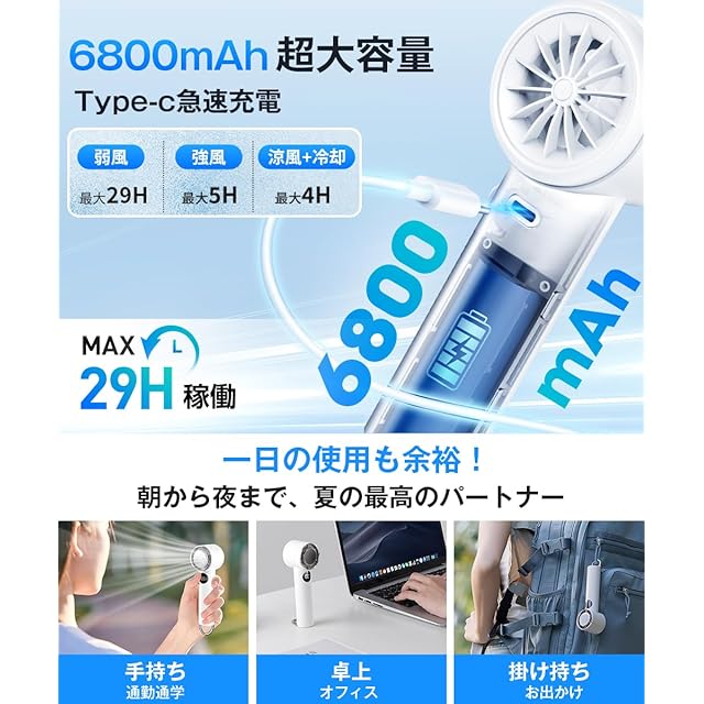 【6800mAh大容量バッテリー搭載|急速充電対応】 冷却ファン 手持ち扇風機 には 6800mAh の 大容量 リチウムバッテリーを内蔵しており、連続使用時間が非常に長く、日中の外出や屋外作業時でも電池切れの心配がありません。 ハンディ扇風機 には USB Type-C 急速充電 に対応しているため、わずかな時間で充電が完了し、すぐに再び使用可能。 携帯扇風機 には電池持ちが良く、 長時間 の外出時にも心強い 冷却プレート ハンディファン です。防災グッズとしての備えにも適している ハンディファン です。