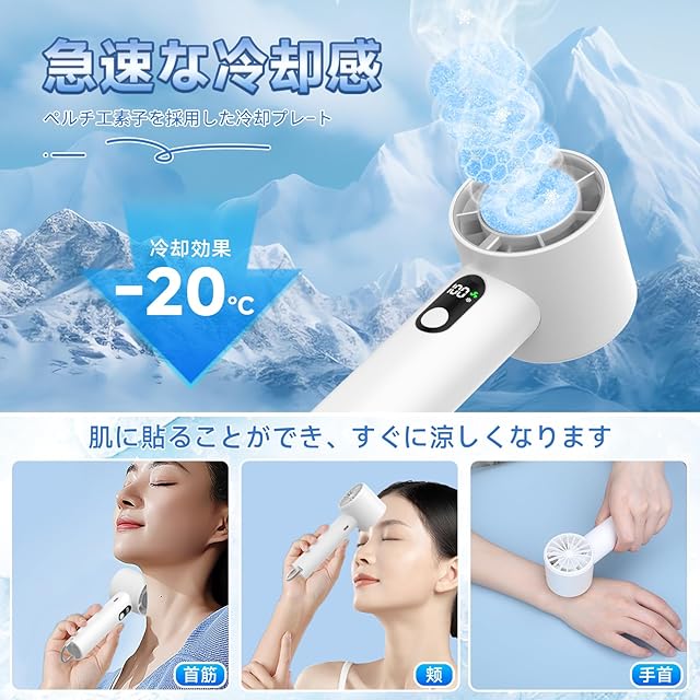 1秒で瞬間冷却-20℃:冷却プレートを備えたこのポータブルファンは、空気を吹くだけでなく、すぐに冷却することもできます。インスタント冷却ポータブルファンには、ペルティエ半導体冷却プレートが装備されています。空気を吹き付けるときは、キーをオンにして1.5秒ターンを押して、冷却モードをオンにします。 1秒後、冷却プレートにクールダウンとクールな霜が表示されます。冷却機能を備えたハンドヘルドファンは、額、首、手首などに直接取り付けることができます。物理的な冷却のために、熱い肌が氷を塗るように即座に冷却できるようにします、最高20℃の体感温度を下げることができ。冷却効果が必要ない場合は、1.5秒のターンを押してキーを押して、実行するのが長くキャンセルできます。