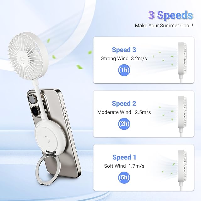 【マグネット式携帯扇風機】この新しいデザインの扇風機はiPhone 15/14/13/12シリーズと特別に互換性があります。パッケージには磁気ステッカーリングが含まれています、それはあなたの携帯電話ケースまたは他のブランドの携帯電話に取り付けることができます。片手で簡単に持つことができ、もう一方の手を自由にすることができます。