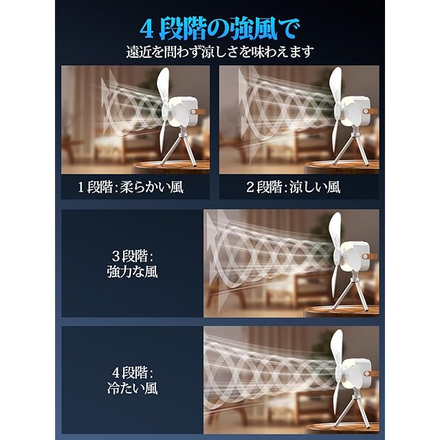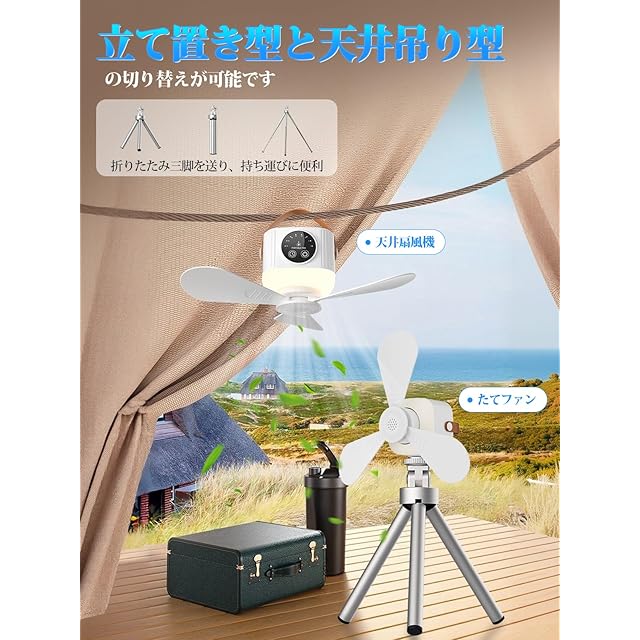 ❄【2025年最新登場吊り下げ扇風機・携帯扇風機】吊り下げ用フックが付属しているので、テントや室内の天井に直接吊るして吊り上げ扇風機として暑い夏を快適に。また、付属の三脚スタントを取り付けば、瞬間に卓上式扇風機に変身可能!ファンの回転によってテントの空気を循環させ、温度のムラを軽減させ、蒸し暑い夏キャンプ場でも快適な空間を作り出せます。アウトドア・自宅に問わず、いつでも、テント、リビング、寝室や書房など、様々のシーンで大活躍!
