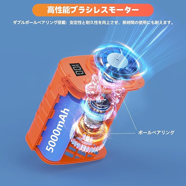 強力な風力と長時間の稼働時間:高性能モーターを搭載し、最大12 m/s(39 ft/s)の風速を実現。5段階の風量調節が可能で、さまざまなニーズに対応します。内蔵の5000mAhバッテリーにより、最大29時間の連続運転が可能で、外出先でも涼しさを持続させる効率的な充電式ポータブル扇風機です。