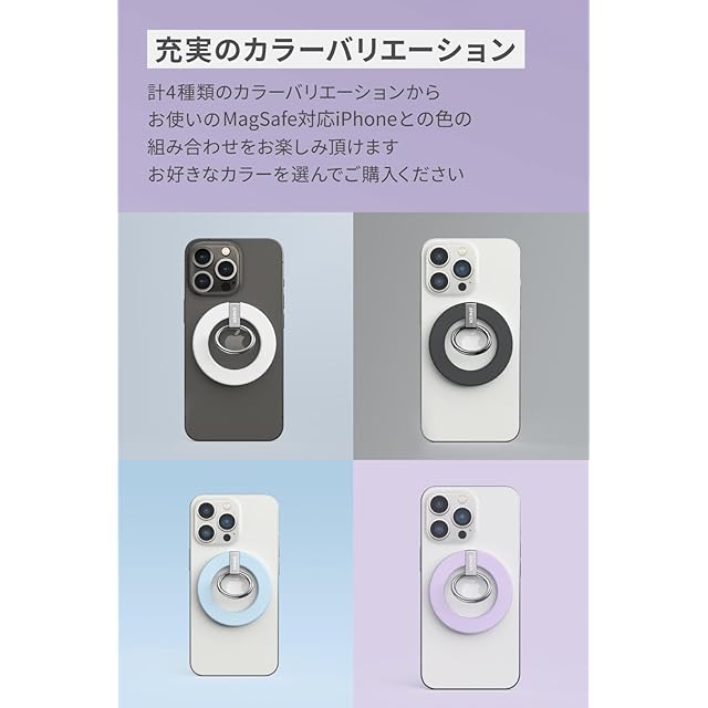 強力マグネットでピタッと装着:MagGoシリーズのマグネット式マグネット式スマホリング。取り外し可能なマグネット式スマホリング。約800gまでの荷重に耐える強力マグネットでお使いのMagSafe対応iPhoneシリーズにしっかりとスマホリングが固定されます。