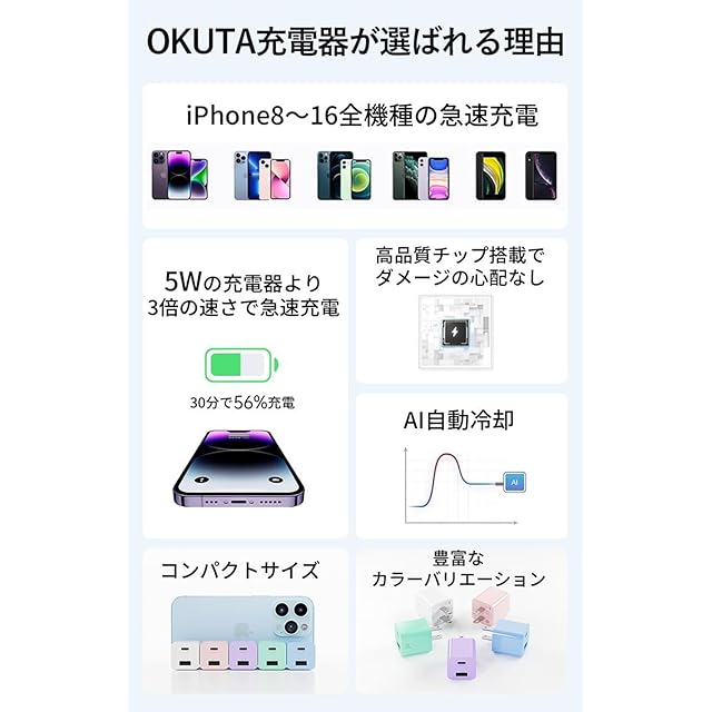 【カラー&サイズ】AC充電器:グリーン、ピンク、パープル、ブルー、ホワイト