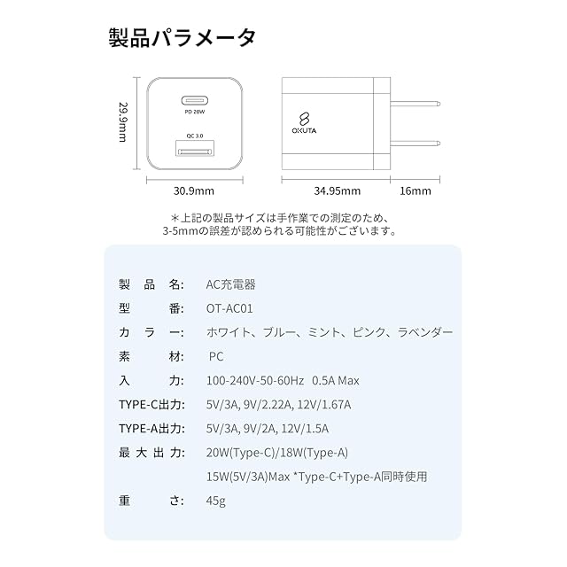 【カラー&サイズ】AC充電器:グリーン、ピンク、パープル、ブルー、ホワイト