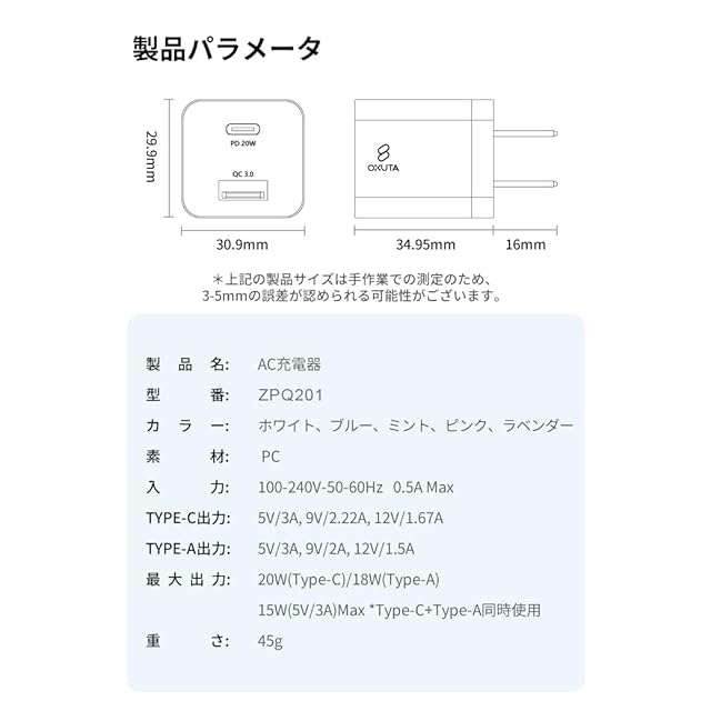 【カラー&サイズ】AC充電器:グリーン、ピンク、パープル、ブルー、ホワイト。 iPhone充電ケーブル:グリーン、ピンク、パープル、ブルー、ホワイト。