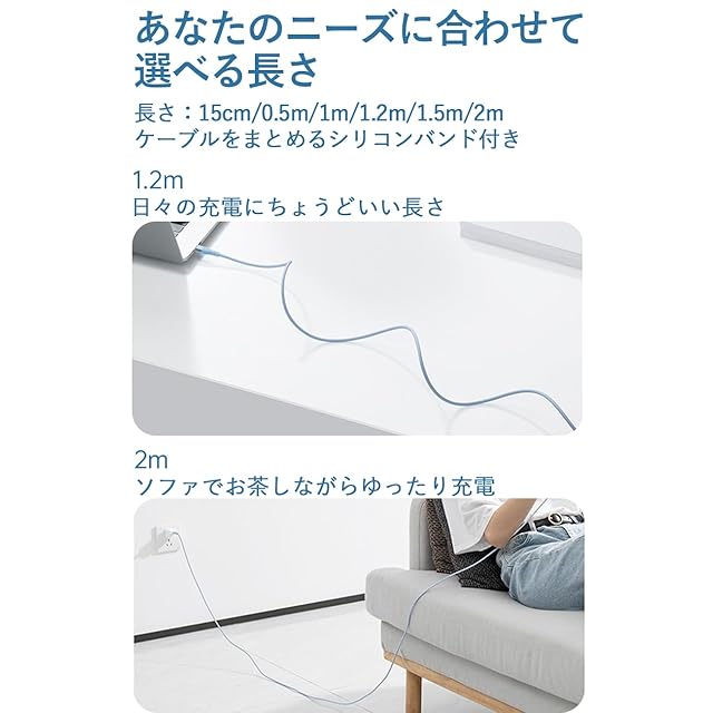 【やわらかく、絡まない】束ねてバッグやポケットに入れたり、モバイルバッテリー等の携帯用充電器に巻き付けて持ち運んだりしても絡みにくく、出し入れもスムーズです。巻いたりまとめたりしても癖がつきにくいため、いつでもスマートにご使用いただけます。