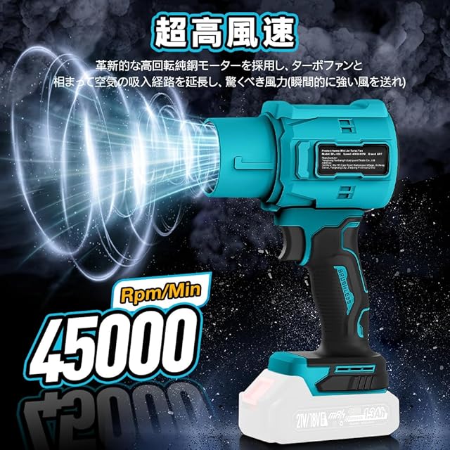 UPF ブロワー 洗車 超強力 2種類のノズル付き エアダスター 電動 380W 高効率 45000RPM マキタ18V互換バッテリー対応 電動エアダスター 充電式 70MM特大ターボファン コードレス ブロワー 小型 (PC 掃除/キーボード/車内/エアコン/洗車用/水滴/落ち葉の吹飛ばし/庭掃除/除雪等)ブルー