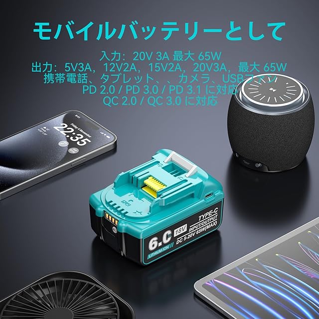 ■【対応バッテリー】14.4V:BL1415/BL1415N/BL1430/BL1430B/BL1440/BL1450/BL1460B 18V:BL1815/BL1815N/BL1820B/BL1830/BL1830B/BL1840/BL1850/BL1850B/BL1860Bなど充電できます。当バッテリーはType-C PDポートを搭載しており、急速充電に対応しています。これにより、さまざまなデバイスを素早く充電できるため、効率的な充電体験を提供します。幅広い小型電子機器の充電が可能で、出先でも手軽に使用できる便利さを兼ね備えています。さらに、108Whの大容量を誇るこのバッテリーは、災害時にもモバイルバッテリーとして安心してご利用いただけます。日常使いや非常時の備えとして、ぜひお勧めいたします。