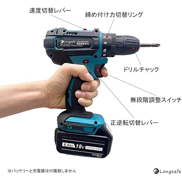 安心のブランド「 Longsafe 」<br> <br> 【型番】:充電式 ドライバー マキタ互換 DF33DZ<br> 【回転/分】:高速 0~1,500、低速 0~400 18段トルク調整<br> 【設定豊富ライトあり】20段クラッチで豊富なトルク設定可能ライトあるため暗い所も活躍でき家具の分解や組み立も簡単になります。<br> 【入門の方やブロの方】入門の方やブロの方にもおすすめです何よりバッテリーはマキタ純正互換両方対応しているため工具集める時バッテリー問題も解消。<br> 【穴あけ能力】穴あけ能力鉄工 10(mm)、木工 38(mm)、ネジ締め能力(mm)木ネジ 6.0x75、小ネジ M6、チャック能力(mm)1.5~10、回転数[回転/分]高速 0~1,500 低速 0~400<br> <br> ◆互換性商品ですが以下のマキタ純正バッテリーに対応しております。<br> BL1820 BL1830B BL1860 BL1860B BL1890 BL1890B<br> BL1420 BL1430 BL1430B BL1460 BL1460B 対応<br> ※ライトバッテリーには対応しておりません<br> ※バッテリー、充電器は別売り<br> ※商品のデザイン、色等は予告なく変更となる場合がございます<br>