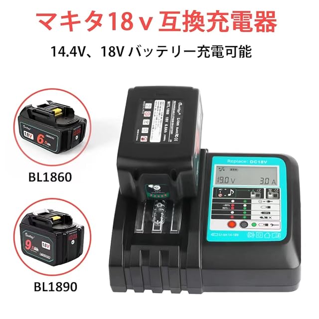 1.液晶パネル搭載 充電状況の確認が便利です。マキタ18V純正、互換バッテリーは充電可能、バッテリー充電始まりと終わりにも提示メロディ付いています。