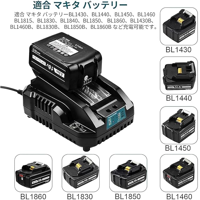 *** 【互換マキタ 18v バッテリー 充電器セット】:【互換マキタ 18v バッテリー1個】商品名:bl1860b電圧:18v 大容量:6000mAh 種類:マキタ互換電池 個数:1本【DC18RC】入電圧:100ー220V 入力周波数:50ー60Hz 出力電圧:直流14.4-18v 出力電流:直流3A 安定性に定評のある高品質セル搭載 高品質モデル 残容量表示+自己故障診断:バッテリーの状況もランブでお知らせ!PSE とCEマーク取得済み bl1860b現在すべての最新型セールに初期搭載されており、さらに長時間稼働と長寿命を実現した。