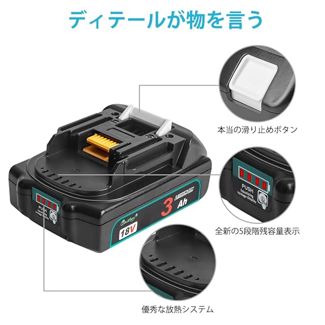 【型番】: 薄型BL1830 マキタ互換バッテリー【電圧】:18V 【容量】:3000mAh【電池タイプ】:リチウムイオン(LiIon)専用設計にて開発。工場出荷時に入念なテストを繰り返す事で品質レベル安定させています。高品質で大変人気の商品です.【対応機種】:純正バッテリーBL1830対応の機種対応できます。純正低速充電器対応できます。マキタ急速充電器と互換急速充電器には対応できないです。