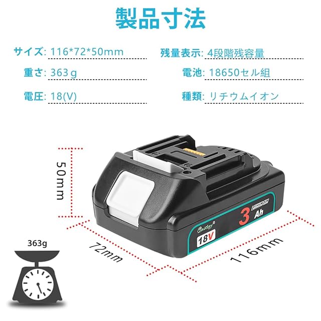本製品着脱方式:スライド式。4段階残容量表示でわかりやすいです。3000mAh実容量で耐久性が良い、長寿命セル搭載、2個セットで使い便利です。