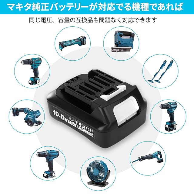 商品仕様<br> 商品名:10.8Vマキタ互換バッテリー<br> 型番:BL1015B<br> 電圧:10.8V<br> 容量:3000mAh<br> タイプ:リチウムイオンバッテリー<br> 対応充電器:DC10WC、DC10SA、DC18RE<br><br> BL1015B Makita 10.8V互換バッテリーに、高品質バッテリーセルが採用され、過電流、過充電と過放電を防止する機能付きの保護回路が搭載されておりますので、使用安全やバッテリー寿命への心配はなく、ご安心にお使いいただけます。<br> 各製造プロセスに厳格な品質管理基準を貫いて、不良率を1%以下に控えています。専門的な設備で寿命試験を行います。<br> 寿命試験内容:ボタン破壊試験 バッテリーを充電器に着脱 バッテリーを充放電 落下試験<br> 出荷前に正規テストを繰り返すことで出荷されたバッテリーは寿命試験に合格しました。安格ですが、商品の耐久性や性能は純正品と遜色がないです。<br><br> 適用機種<br> インパクトドライバ:TD111D,TD110D ドライバドリル:DF033D,DF332D,DF333D<br> 震度ドライバドリル:HP332D,HP333D マルノコ:HS301D<br> マルチツール:TM30D アングルドリル:DA332D<br> マルチカッタ:CP100D レシプロソー:JR104D<br> ジングソー:JV101D,JV103 クリーナー:CL106,CL107,CL108FD,CL121D<br> ピンタッカ :PT354D タッカ:ST113D,ST313D<br> ブロワ :UB101D 草刈機: MUR100D<br> ミニ生垣バリカン: MUH264DSH 生垣バリカン: MUH353D<br> 芝生バリカン MUM600D ウォールディテクタ:WD180D<br> スピーカー:MR200,MR202,MR203 ラジオ付きテレビ:TV100<br> ラジオ:MR051,MR103,MR113,MR51 空気入れ:MP100D<br> LEDワークライト:ML103,ML104 フラッシュライト:ML105,ML106<br> USB用アダプター:ADP06,ADP08 ファン:CF100,CF101DZ,CF202DZ<br> 屋内・屋外兼用墨出し器 SK40GD,SK20GD,SK10GD SK506GD,SK313GD,SK210GD,SK505GD,SK312GD,SK209GD<br><br> 電池ご使用のヒント<br> 1.新品のバッテリーはご使用の前に満充電してください。<br> 2.新品のバッテリーは満充放電を2-3回繰り返してください。<br> 3.バッテリーを使わずに置いていたら、自己放電しますので、ご使用の前に満充電してください。<br> 4.バッテリーは2-3ヶ月ごとにすっかり使い切った後で満充電しておいてください。<br> 5.電池のショートが起きる危険性があるため、バッテリーを金属部品と一緒に放置しないでください。<br> 6.バッテリーを落としたり衝撃を加えたりしないでください。<br> 7.水分や湿気の多い場所に保管しないでください。<br>