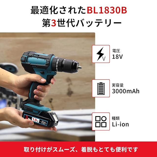 型番: bl1830b 電圧:18V 容量:3000mAh 実容量 認証:PSE、CEマーク取得済み タイプ:リチウムオム電池高品質採用 多機能付き:バッテリーは残量表示が付いています。高品質セルを採用し、耐久性が高く、500回放充電後80%性能を維持出来ます