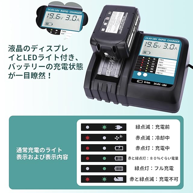 <br>商品仕様 <br>互換マキタ 充電器 DC18RF 液晶付き <br>◆入力電圧:100V-240V <br>◆入力周波数:50ー60Hz <br>◆出力電圧:14.4v-18v <br>◆液晶パネル搭載 <br><br>充電状況の確認が便利です。互換マキタ18V純正、互換バッテリーは充電可能、バッテリー充電始まりと終わりにも提示メロディ付いています。 <br><br>互換14.4v-18v バッテリー に対応 <br>14.4V:BL1415N/BL1430/BL1430B/BL1440/BL1450/BL1460B/BL1490B <br>18V:BL1815N/BL1820B/BL1830B/BL1840/BL1850B/BL1860B/BL1890Bなどに <br><br>注意事項 互換マキタ 18v バッテリー BL1411G BL1413G BL1415G BL1811G BL1813G BL1815Gと旧型のライトバッテリーに充電出来ません。充電器 DC18WA DC18SG に互換出来ませんが。ご注意ください。 <br><br>多数保護機能付き 過充電防止・過放電防止・過電流防止・過電圧防止・過熱防止機能付き、純正品と遜色なく使えます。 <br>デジタル通信機能バッテリーを搭載したメモリチップは使用履歴を記憶しています。