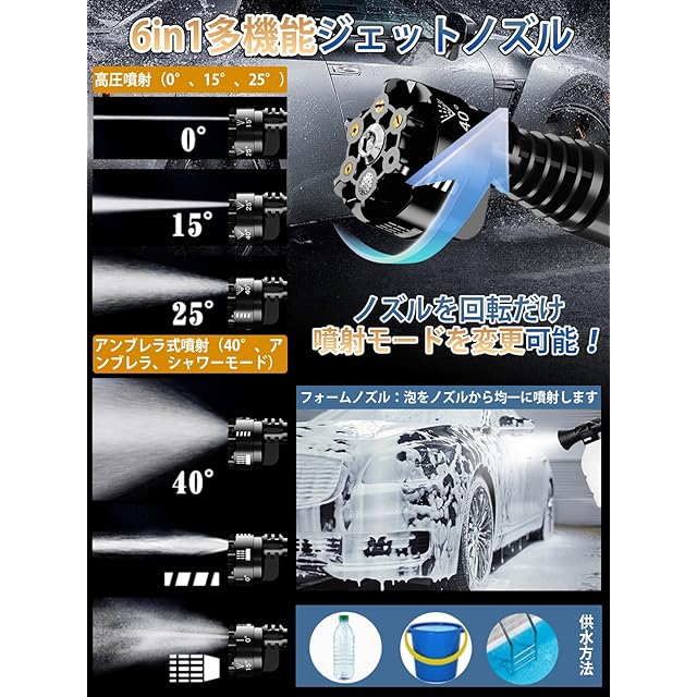 高圧洗浄機 コードレス 充電式 家庭用 洗車 20000mAh大容量バッテリー マキタ互換バッテリー 自吸式 噴射距離10M 6in1ノズル フォームガン付き コンパクト 多機能 洗車機 高圧洗浄器 軽量 ポータブル 水圧 ハンディ エアコン/庭/屋外/階段/外壁/ベランダ/黄砂掃除/年末大掃除 日本語取扱説明書