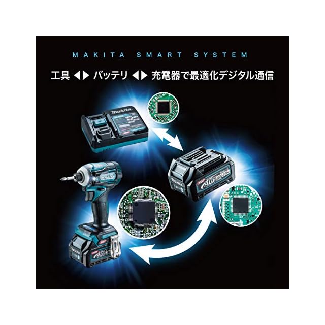 工具⇔バッテリ⇔充電器間で最適化デジタル通信。給電・充電共に最適化を実現し、高負荷時の連続作業時間アップ(最大約2.2倍※)・バッテリ長寿命化(約50%アップ※)を両立 ※マキタ基準による
