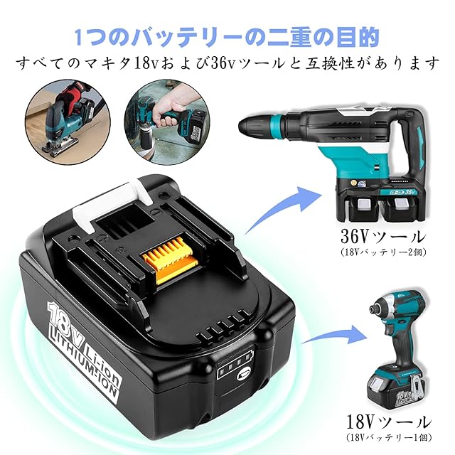 <b>商品仕様:</b> <br> 牧田電池:<br> 容量:6000mAh<br> 電圧:18V<br> 種類:高品質リチウムイオン電池<br> <br> 充電器:<br> 出力電圧:直流14.4-18v<br> 出力電流:直流3A<br> <br> <b>認証:</b><br> PSEとCEマークを取得した。<br> CE認定バッテリー:CEマークは標準の適合マークであり、欧州連合(EU)で販売される製品に貼付する必要があります。 これは、国際的に販売されている多くの電気機器に必要な法的基準です。 PSEの法定基準:日本で販売されている電化製品がPSE法の対象となるかどうかを判断する法律であり、範囲内の製品については、適合性検査後にPSEマークが付けられます。<br> <br> <b>分かりやすい充電状態:</b><br> LED指示ランプが有りまして、冷却保護機能が付いて、デジタル通信によりバッテリー状態を診断する。高温や充電状態等全てLEDランプで表示して一目瞭然です。<br> 本体とバッテリーの接触はマルチコンタクト端子により設置が安定します。また振動にも強い設計です。ご安しん使ってください。<br> 商品は合理的な構造で、中にスペースがたっぷりあって、後ろと下と両側に通風口がいっぱい設けられて、冷却風が流れやすいです。<br> <br> <b>適合工具シリーズ:</b>マキタ純正バッテリーが対応できる機種であれば、同じ電圧、容量の互換品も問題なく対応できます。<br> マキタ PB シリーズ:PB108D / PB108DRFX / PB108DZ / PB180DRFX<br> マキタTDシリーズ:TD140D / TD144D / TD144DRFX / TD144DZ / TD145DRFXB / TD145DRFXL / TD145DRFXP / TD145DRFXW / TD146DRFP / TD146DRFX / TD146DRFXB / TD146DRFP / TD146DRFXB / TD146DRFXB / TD146DRFXL<br> マキタTPシリーズ:TP140DRFX / TP141DRFX / TP141DZ<br> マキタTWシリーズ:TW251D / TW251DRFX / TW450DRFX<br> マキタVRシリーズ:VR350D / VR350DRFX / VR350DZ / VR450D / VR450DRFX / VR450DZ<br> など。<br> <br> <b>バッテリーの保管と使用:</b><br> 使用前に新しいバッテリーを完全に充電してください。<br> ニッケルカドミウム、ニッケル金属水素化物、およびリチウムイオン電池は、保管中に放電します。 ご使用前にバッテリーを充電してください<br>。 バッテリーが完全に使い果たされた後、バッテリーは2〜3か月ごとに完全に充電する必要があります。<br> バッテリーを金属部品と一緒に保管しないでください。保管すると、バッテリーが短絡する可能性があります。<br> バッテリーを落としたり、衝撃を与えたりしないでください。<br> 湿気の多い場所に保管しないでください。<br>