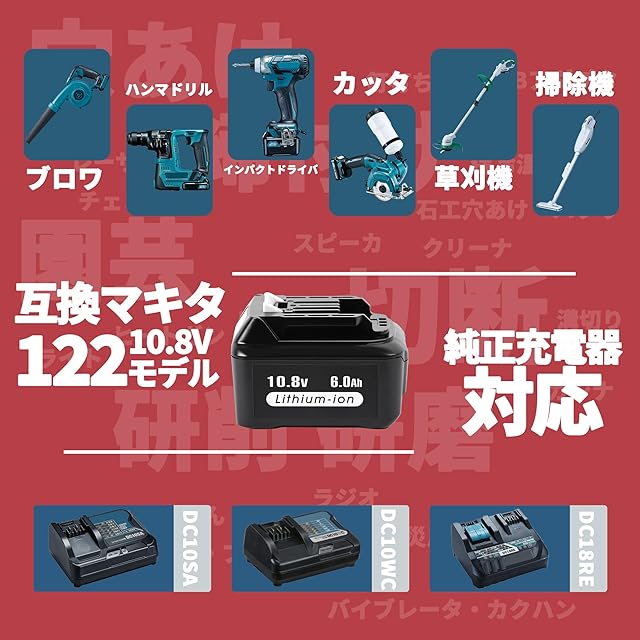 【仕様】品名:BL1015 マキタ 10.8V バッテリー 容量:6.0Ah(6000mAh) 重さ:368g 種類:互換用リチウムイオンバッテリー ( BL1015 BL1040B)対応のマキタ10.8V電動工具に使用できます。草刈機 掃除機、チェーンソー、集塵機、ブロアー、空気入れなど10.8V(スライド式)の機種(約122モデル)