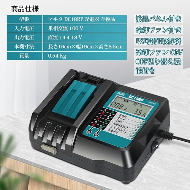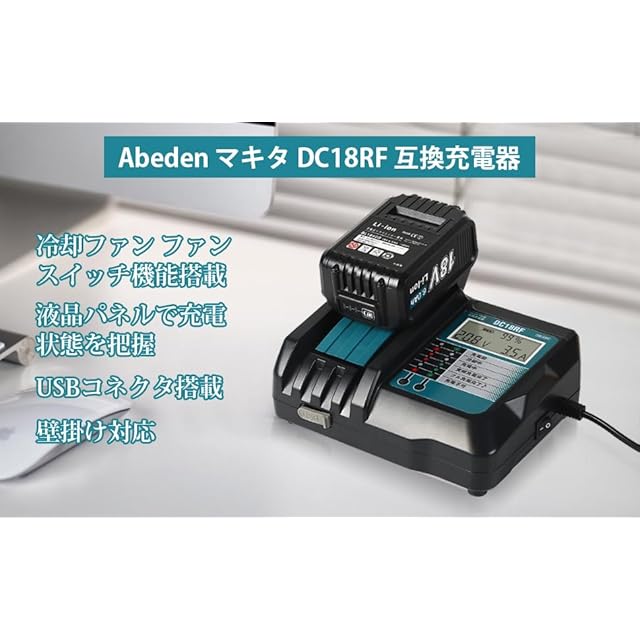 Abeden 冷却ファン搭載 マキタ DC18RF 充電器 互換品 ファンスイッチ付き ON/OFF切り替え 液晶付き 14.4v 18v 3.5A マキタ18Vバッテリーチャージャー DC18RF充電器 充電完了メロディ 壁付け スマホ等充電用【USB充電ポート付】
