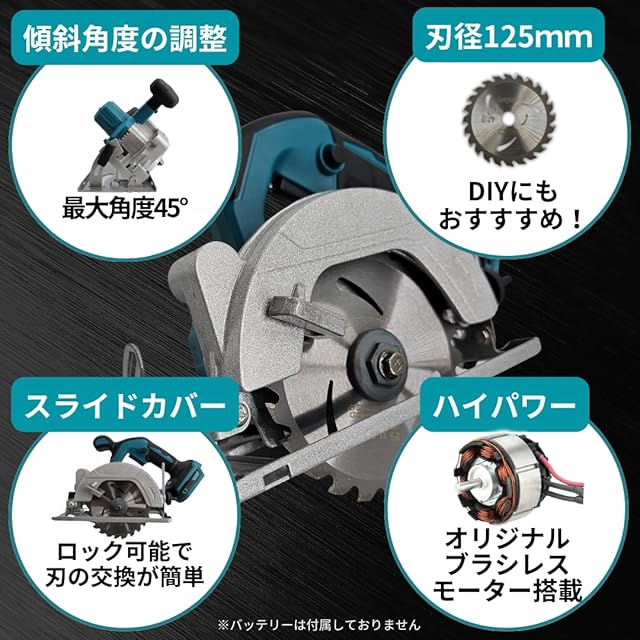 マキタ互換品 丸ノコ 充電式 丸鋸 丸のこ マルノコ まるのこ 電動工具 ブラシレス のこぎり 電気のこぎり 電ノコ 電鋸 チップソー 電動工具 長続航 木材 合板 コードレス 電動 18V 14.4V バッテリー 刃 刃外径 125mm 対応 バッテリー 充電器 別売 Longsafe (MAR12501-BL)