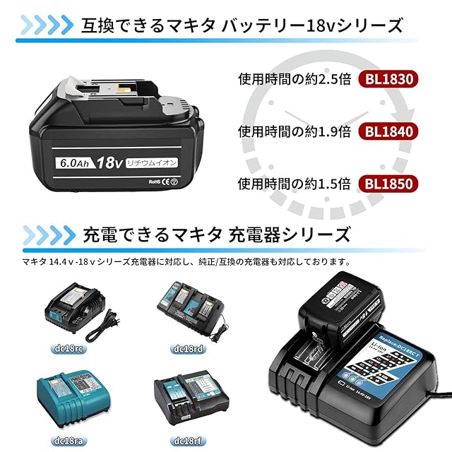 【純正と完全な互換性】マキタ 18v バッテリー :BL1815N BL1820B BL1830B BL1840B BL1850B BL1860B BL1890B 194205-3 194230-4 LXT400 マキタ 充電器 DC18RA、DC18RC、DC18RD、DC18SD、DC18RFなどに対応できます。弊社製の充電器DC18RC DC18RD DC18RFも対応しております。(注意事項:マキタ 18v 旧型のBL1811G BL1813G BL1815GライトバッテリーとDC18SG DC18WA充電器に互換性がないので、ご了承ください!)