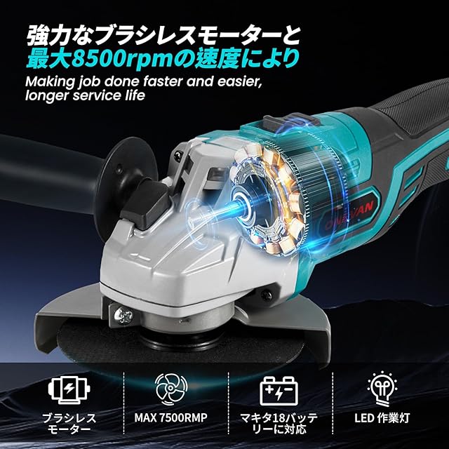 マキタ互換品 ONEVAN ディスクグラインダー コードレス式 125mm 砥石3枚付き 4000mAhバッテリー2本付属 マキタのバッテリー互換可能 変速 3段階変速 (本体⁺電源セット+砥石3枚)