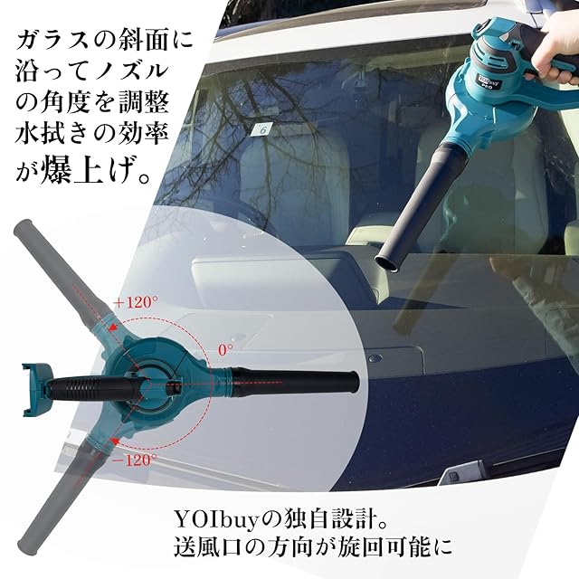 【特徴】送風口は-120度から+120度まで旋回可能。ノズルと本体を垂直にして、洗車後の前ガラスの水切りに大活躍。