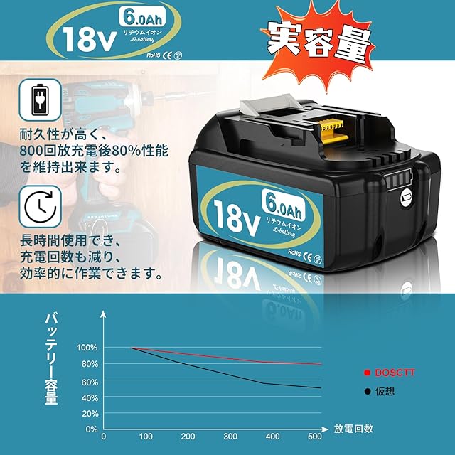 【長時間作業】6.0Ah実容量なので、電動工具が長い時間作業できます。耐久性が高く、800回放充電後80%性能を維持出来ます。純正品よりも負けない品質。純正バッテリーと変わらない使用感、同様に使用できます。対応充電器DC18RC DC18RD DC18RF DC18SF など。