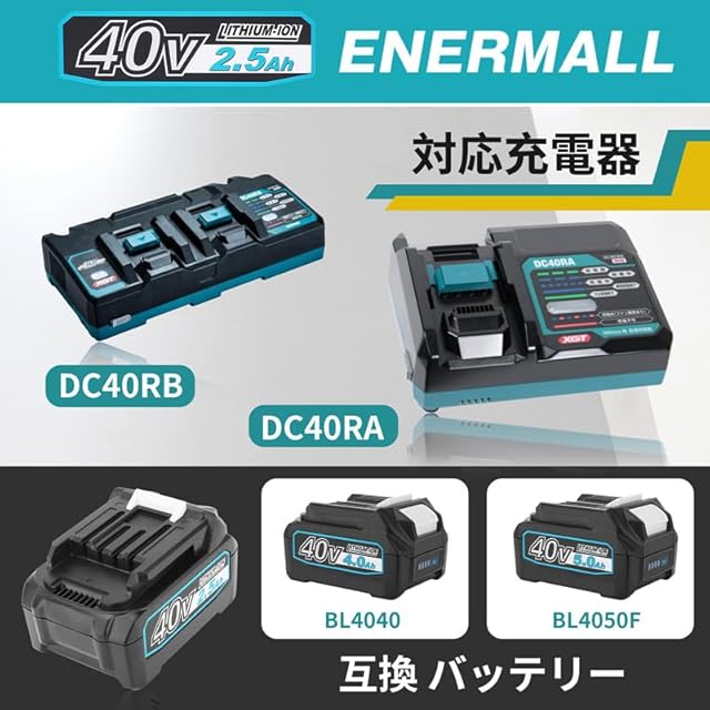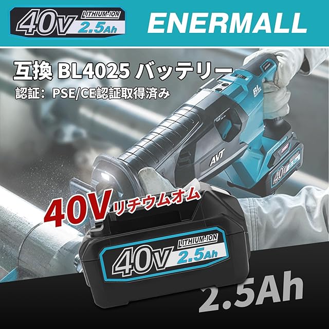 マキタ40Vバッテリー互換 <br>仕様:マキタバッテリー40v BL4025 <br>電圧:40V 容量:2500mAh 種類:リチウムイオン<br><br>Enermallマキタ40vバッテリーのメリット <br>ABS+PC熱耐える材料を採用し、高負荷の作業環境でも通常に性能を持たす. <br>残容量表示+自己故障診断:LEDランプ残容量が一目瞭然です. <br>マキタ40互換バッテリーが大きな基板を使用し、基盤に過電流保護、過充電防止、過放電防止、短絡保護、温度保護の回路保護制御が設置されております. <br>認証:PSE CE 認証取得済み <br><br>互換性: <br>BL4025 互換バッテリー:マキタ40vバッテリー BL4025 Bl4040 BL4060 BL4040F BL4050F BL4080F <br>対応充電器:DC40RB、DC40RA(充電方法は純正品と同じ)<br>互換マキタ40V電動工具:<br>GA033GRMX/GA034GRMX/GA037GRMX/GA052GZ/GA053GZ/GA054GZ/VR001GZAS/VR001GZAM/VR001GZAL/UT001GZ/ST001GRDX/ <br>ST002GRDX/PT001GRDX/FN001GRDX/KP001GRDX/RT001GRDX/RT002GRDX/MUC018GZR1/MUC018GZR2/MUC018GZR3/MUC019GZ1/ <br>MUC019GZ/MUC019GZ3//MUC019GZ4/MUC002GRDX/MUC008GDR1/MUC008GDR2/MUC008GDR3/MUC008GDR4/MUC008GDR5/MUC008GDR6/ <br>MUC009GD1/MUC009GD2/MUC009GD3/MUA002GZ/MUH001GRDX/MUH002GRDX/MUH003GRDX/MUH015GRDX/MUH010GRDX/MUH011GRDX/ <br>MUH012GRDX/MUR015GRM/MUR016GRM/MUR017GRM/MUR018GRM/MUR013GZ/MUR014GZ/MUR005GRM/MUR006GRM/MUR007GRM (マキタ純正 バッテリー対応機種に準ずます)
