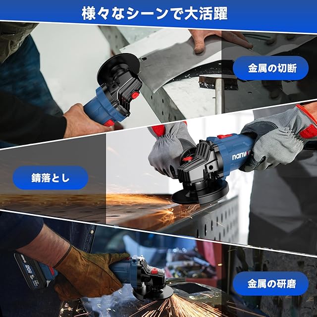 【多用途】砥石寸法:外径100x内径16(15)mm。当社充電式ディスクグラインダーは金属・木材の研磨、金属の切断、サビ落とし、塗装剝がれ、曲面研磨など多彩なシーンに使えます。コードレスの設計で、場所を選ばず、自由自在に作業できます。