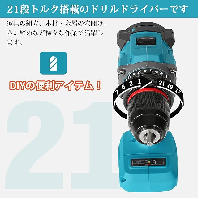 二段変速&無段変速:高/低2速、21段トルク搭載のドリルドライバーです。作業に合わせて自由にトルクを調整します。電動ドリルの回転スピードは2段階(0~450RPM/0~1800RPM)が切り替え、トリガーを握る力の強弱で無段階微調整が可能です。