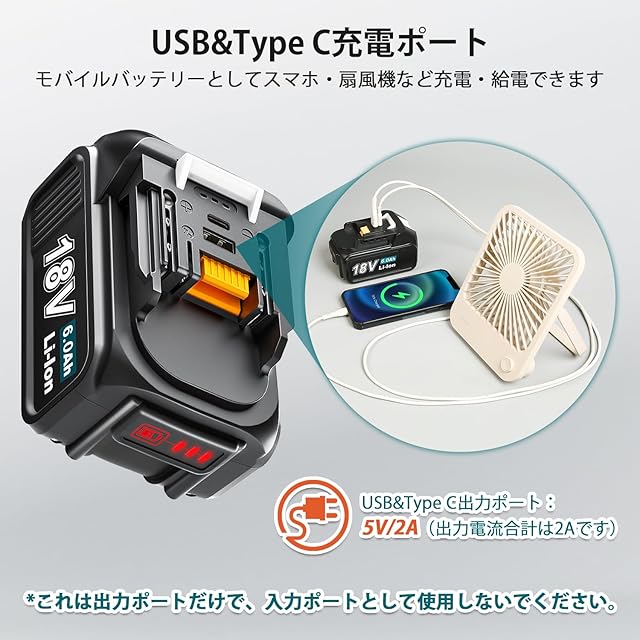 【モバイル充電が十分に便利】この18v互換バッテリーがアップグレードされ、大きいな電気基盤が採用されたので、バッテリーの上部にType-Cの充電ポート(5V ・2A )が設置されました。外出かけ作業際にも移動中にも携帯電話などのデバイスが電源切れたのが、心配なし予備充電が便利です。収納用の固定ホルダーがあり、壁や棚にかけてバッテリーの整理と取りやすさが格段に大満足です。