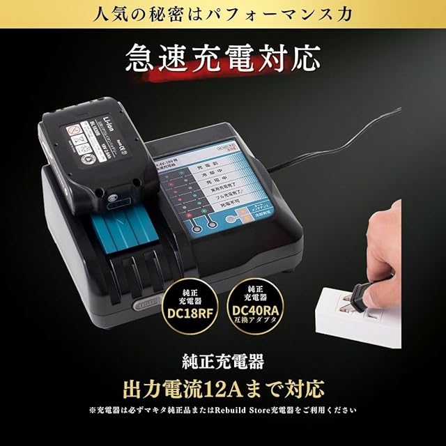 【対応充電器】全純正充電器対応。 出力電流12Aまで対応(DC18RF等)