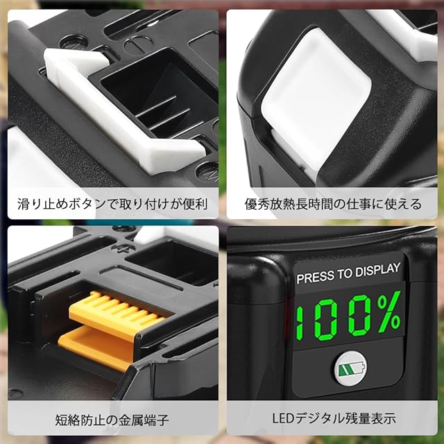 【安全性】高品質セル搭載で、耐久性が高く、長期間使用可能です。保護回路も内蔵しているので、安心してご使用頂けます。高出力電動工具はバッテリーの寿命を縮める可能性がありますので、高出力電動工具でこのバッテリーを使用する場合はご注意ください。(ご注意:バッテリーを保護するために、バッテリーを使用完了後、電動工具から取り外してください。電動工具に付けたままにしないでください)