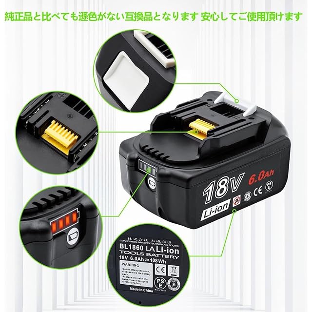 幅広く使われる: マキタバッテリー18v BL1860B 対応の機種:BL1860B、BL1850、BL1840、BL1830、BL1830B、BL1820B、BL1815、BL1815N など。このBL1860互換バッテリーはたっぶり6.0Ah 超高容量入っており、頻繁に充電する必要ないです。