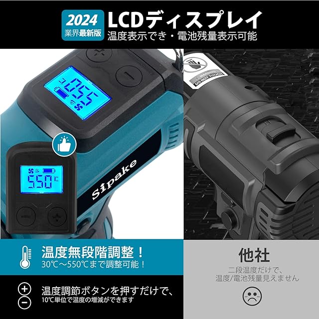 【2024革新版】Sipake ヒートガン 小型 コードレス 充電式 熱風機 ホットガン 2段階風速 急速加温 30~550°C 「LCDディスプレイ・温度表示可能」 マキタ makita 互換 軟化 加工 ラベル 剥がし 収縮包装 乾燥 熱収縮チューブ PVC ノズル3本付き (バッテリー付き)