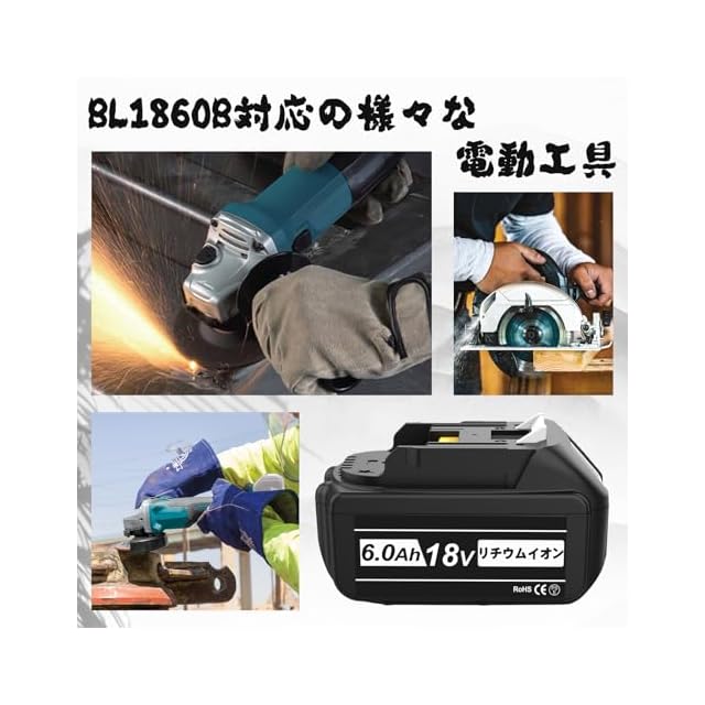 <br>【型番】互換 マキタ18vバッテリー BL1860B <br> <br> 対応メーカー:powayup <br><br> 商品詳細 <br> 【容量】6000mAh (6.0Ah) <br> 【電圧】18V <br> 【認証】PSE・CEマーク取得済 <br> 個数 2個セット <br><br>特徴 <br>ダブル新機能付き:残量表示✙自己故障診断。 <br>過電流保護機能、過充電防止機能、過放電防止機能など保護回路が内蔵されて、ご安心してご使用頂けます。 <br>寿命特性、充電時間、連続使用時間が純正品と比べても遜色がないです。 <br>多種多様な機種に対応するパウー メモリ効果がないため、継ぎ足し充電も可能になりました。自然放電が少なくて、長持ちできます。<br><br>対応機種 <br> 【インパクトドライバー】 <br> TD145D・TD144・BTD140・BTD140Z・BTD141・BTD144 <br> 【4モードインパクトドライバー】 <br> TP144・BTP140・BTP140Z <br> 【アングルインパクトドライバー】 <br> TL061・BTL061・BTL063 <br> 【スクリュードライバー】 <br> BFR550L・BFR550Z・BFR750・BFS450 <br> 【インパクトレンチ】 <br> TW251D・TW450・BTW251・BTW253・BTW450 <br> 【コードレスドリル】 <br> BDF451SFE・BDF452HW <br> 【ドライバドリル】 <br> HP454D・BDF451・BDF454Z・DF454D・HP454DZ・BDF442RFE・DF445D <br> 【アングルドリル】 <br> DA350D・BDA350 <br> 【アングルグラインダ】 <br> BGA452・BGA452Z <br> 【コンビドリル】 <br> BHP451・BHP452・BHP454 <br> 【ハンマドリル】 <br> HR202D・HR202DRFX・HR202DZK・BHP451・BHR240・BHR202・BHR202RFE・BHR202Z・BHR240・BHR240Z・BHR241・BHR241Z <br> 【マルノコ】 <br> HS630D・BSS610・BSS610SFE・BSS610X2・BSS610Z・BSS611X・BSS611Z・BCS550・BSS501 <br> 【生垣バリカン】 <br> MUH401D・MUH451D <br> 【ジグソー】 <br> JV180D・BJV180・BJV180Z <br> 【レシプロソー】 <br> JR182D・BJR181・BJR182 <br> 【噴霧器】 <br> JV140D・MUS104D・MUS154D <br> 【ポータブルバンドソー】 <br> PB180D・BPB180・BPB180Z <br> 【鉄筋カッタ】 <br> SC162D <br> 【タッカ】 <br> BST221Z <br> 【クリーナ】 <br> CL180FD・CL182FD <br> 【ディスクグラインダ】 <br> GA402D <br> 【ハンドグラインダ】 <br> GD800D <br> 【ラジオ】 <br> MR100・MR100W <br> 【チェンソー】 <br> UC122D <br> 【蛍光灯】 <br> ML184 <br> 【小型集じん機】 <br> VC350D <br> 【フラッシュライト】 <br> ML185・BML185・BML184 <br> 【ブロア】 <br> UB182D・BUB182 <br> 【コンビ2ピースキッド】 <br> LXT202 <br> 【4ピースキッド】 <br> LXT400・LXT401・LXT402 <br> 【6ピースキッド】 <br> LXT600 <br> 【コンクリートバイブレータキッド】 <br> BVR350・BVR450・BVR850(純正 バッテリー対応機種に準ずます)