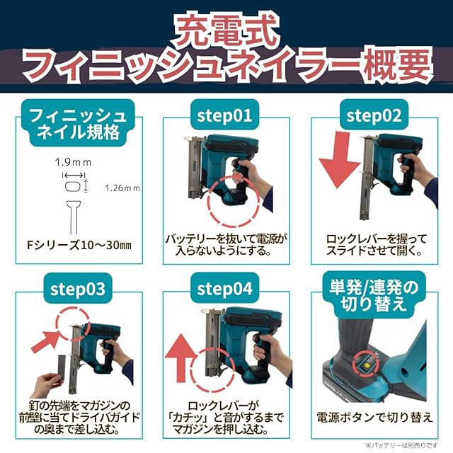 【ご注意】本製品はフィニッシュネイル専用です。ステープルやピンネイルはご使用いただけません。バッテリー・充電器は別売となります。