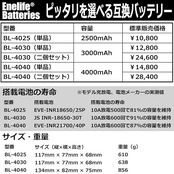 ◆2◆ <本製品> マキタ互換の40Vバッテリーで、最大瞬間放電電流60A、最大継続放電電流40Aで、ハイパワー工具にオススメのバッテリーです。 弊社のBL4025とBL4030はマキタ製40V高出力工具(CE001G、US017G、UC016G、UC015Gなど)では使えません。ご使用の場合は保証対象外となります。これらの高出力工具には弊社のBL4040バッテリーをお使いください。