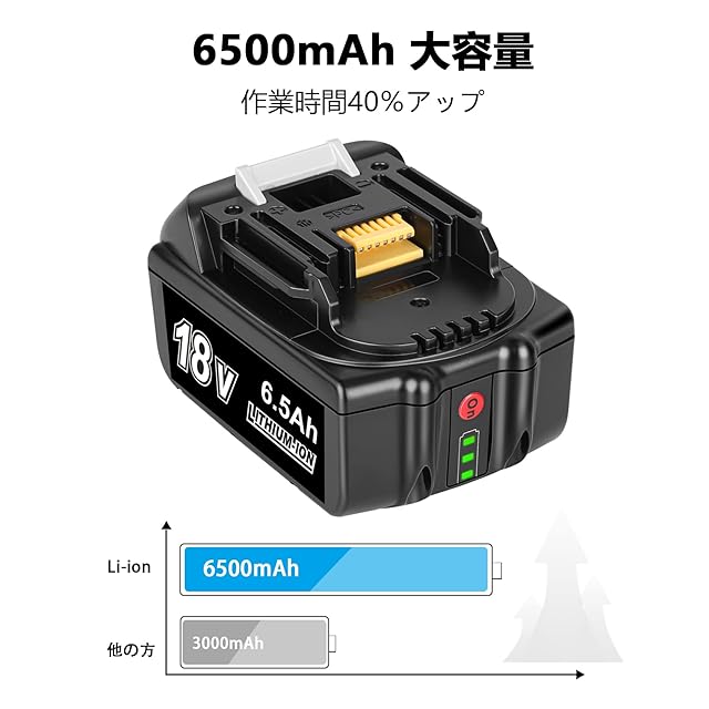 【製品仕様】型番:BL1860 マキタ 18V互換バッテリー電圧:18V 容量:6500mAh(6.5Ah大容量) 着脱方式:スライド式 種類:リチウムイオンバッテリー(Li-ion)。